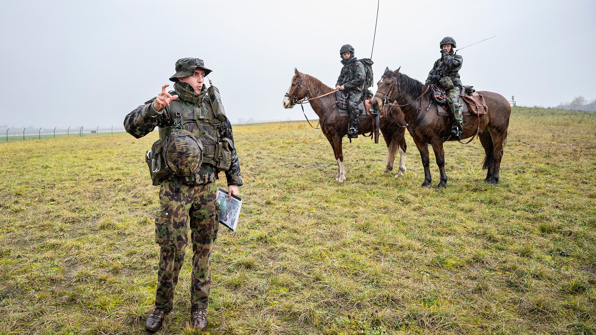 Le bataillon d’infanterie 61 a été engagé du 25 au 29 novembre 2024 à l’aéroport de Zurich-Kloten lors de l’exercice d’ensemble des troupes « SKILL GRANDE 24 » de la division territoriale 4. Il a été renforcé par une compagnie de grenadiers de chars, une compagnie de sauvetage, deux sections sanitaires et un détachement du Groupe vétérinaire et animaux de l’armée 13 formé de 22 cavaliers de patrouille et 15 maîtres-chiens. L’exercice, auquel participaient 1600 militaires, était axé sur la protection d’infrastructures critiques au profit des autorités civiles. Par équipes de deux, les c patr surveillaient une installation radar destinée au trafic aérien civil, une station de transformation ainsi que des parties de terrain le long de la clôture du périmètre de l’aéroport et signalaient les forces adverses.