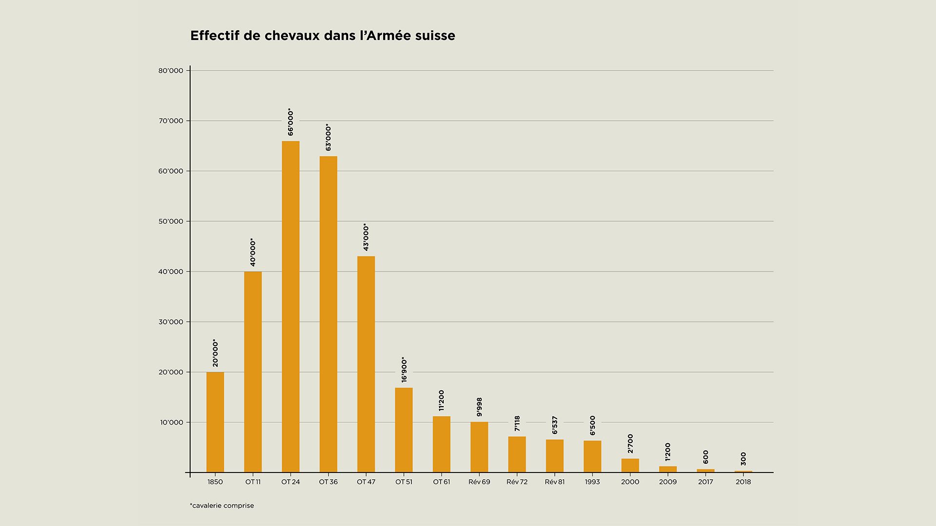 Dans les années 1940, les véhicules à moteur prennent de plus en plus la place des chevaux. Dans l’OT 47, l’armée possède encore 47 000 chevaux. Fin 1947, tous les conducteurs de chevaux deviennent des soldats du train et sont affectés à l’infanterie (au lieu de l’artillerie).En 1972, le Parlement dissout la cavalerie ; l’effectif des chevaux continue de diminuer. Dans l’armée 61 (1961–94), le train compte plus de 10 000 chevaux, en 2000, il n’en reste plus que 2700.
